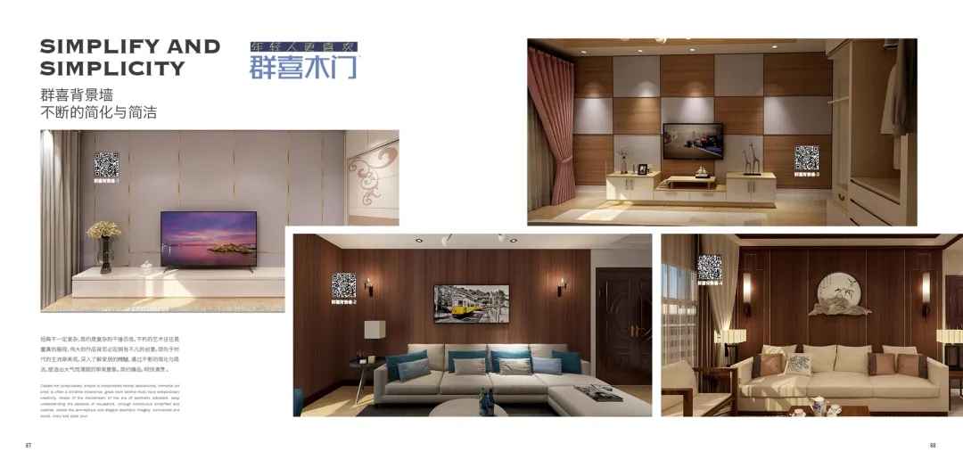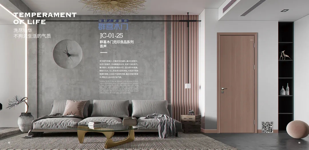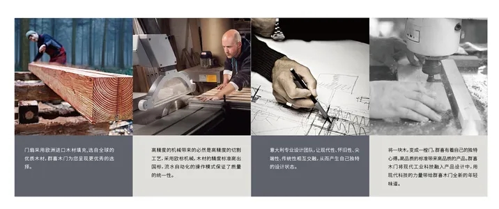 群喜目前已经形成了以“木门”为核心,覆盖铝木门、铝合金滑动门、踢脚线、护墙板、柜门等的定制模式,材料的应用可以最大程度上减轻室内污染,保障人居的健康与安全。